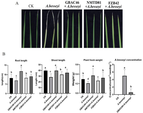In the present study, the selected strains were used as a treatment, and control water was used as a CK. The rice seeds were soaked in a solution of A. besseyi for 36 h, and then seeds were dipped into selected bacterial solutions of OD600 = 1.0 and planted for 1 month in a greenhouse under controlled conditions. The result showed that the disease intensity was small, and the “white tip” lesions were white to yellow–brown in the control seedlings. Whereas, after being treated with the bacterial solution of selected strains, the disease symptoms on leaves were significantly reduced (Figure 6A). The length of the leaf lesions was calculated, and the disease index of different treatment groups was found to be significantly reduced up to 33.56% 45.66, and 30.34 by GBAC46, NMTD81, and FZB42, respectively.