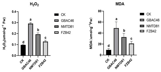 To further examine the effects of GBAC46 and NMTD81 strains on the defense response of rice, we detected the contents of hydrogen peroxide (H2O2) and malondialdehyde (MDA), a product of lipid peroxidation in rice leaves after being treated with the selected strains for 24 h. The results showed that both the GBAC46 and NMTD81 strains could significantly induce the accumulation of H2O2 and reduced the MDA in rice leaves, revealing that the selected strains could induce the defense response of rice compared to the FZB42-positive and CK-negative controls (Figure 7).