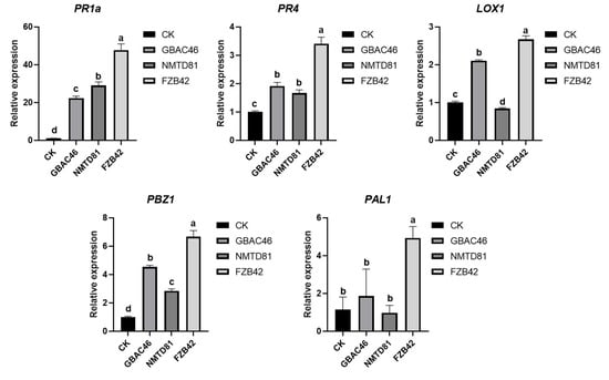The effects of the selected strains on the relative expression of rice plant defense-related (PR) genes were studied. The results revealed that the GBAC46 strain significantly enhanced the relative expression levels of all defense-related genes, such as PBZ1, PR1a, PR4, and LOX1, whereas the PR1a genes were highly upregulated compared to other genes. Similar results were obtained after treatment with the NMTD81 strain, and the relative expression levels of PR-related genes, PBZ1, PR1a, and PR4, were significantly upregulated, indicating that the selected strains could induce high relative expression of rice defense response-related genes (Figure 8).