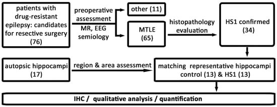 Study design. The study workflow presents the number (in brackets) of cases included throughout the study and further selected for neuropathological and immunohistochemical (IHC) analysis. Out of 34 selected blocks, 13 tissue blocks (38.2%) were both well preserved and had section cut orientation suitable for further analysis. For the IHC part of the study, these 13 HS1 and 13 autopsy tissue samples as control hippocampi were selected. The control group consisted of 13 samples of hippocampal tissue obtained during autopsy within 48 h post-mortem. A neurologist (BS), pathologist (DK), and neuroscientist with expertise in human brain histology (NJM) agreed on the selection of samples based on the suitability of the histological sections for all qualitative and semi-quantitative analyses. MTLE—mesial temporal lobe epilepsy; HS1—hippocampal sclerosis ILAE type 1; IHC—immunohistochemistry.