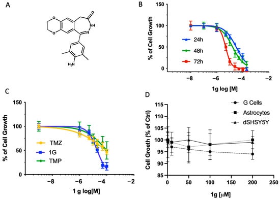 Cell viability of U87MG, dSHSY5Y, primary cerebellar granule neurons and primary astrocytes after pharmacological treatments. (A) 1g chemical structure; (B) Dose-response curves of 1g at different time points on U87MG; (C) Comparison of the inhibitory effect of 1g, TMZ and TMP on U87MG cell viability at 48 h; (D) Effects of 1g on primary cerebellar granule neurons and primary astrocytes after 48 h of incubation times at different concentrations. The values are expressed as % of control ± standard deviation (SD). GI50 is reported in the text.