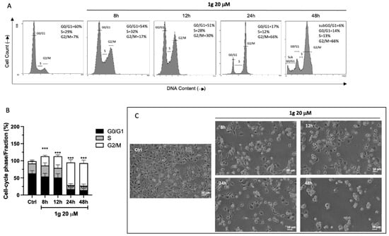 Effect of 1g on U87MG cell cycle. (A) Representative cell cycle distributions assessed by propidium iodide staining and 5′-bromo-2′-deoxyuridine BrdU incorporation in enzymatically disaggregate U87MG cells treated with 20 µM of 1g at the indicated time points. (B) The percentages of cells in G0/G1, S and G2/M phases are presented in the histograms. Data are expressed as the mean ± SD obtained from three independent experiments performed in duplicate. The values are expressed as the mean ± SD of three independent experiments (n = 4 per group). *** p < 0.001 vs. untreated cells (Ctrl), using a one-way ANOVA with Dunnett’s as post-test. (C) Light microscopic micrographs at 20× magnification of U87MG treated or not with 1g 20 µM at different time points.