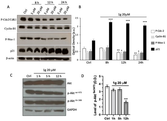 In order to get more inside in the 1g induced G2/M arrest, several cell-cycle determinants directly involved in the G2/M phase transition, such as cyclin B1, phospho-Cdc2 (Tyr15), phospho-Wee-1 (Ser642), and p21Waf/Cip1, were evaluated by immunoblot analysis. Figure 3A shows a decrease of protein levels of phospho-Wee-1 and phospho-Cdc-2 after 12 h, reaching significant values after 24 h in cell treated with 1g at 20 μM compared to the control (Figure 3B). Cyclin B1 immunoreactivity, instead, did not change significantly at all the time points tested. Interestingly, the level of the endogenous p21 Waf/Cip1 protein increased significantly already after 8 h of treatment, reaching a maximal induction between 12 and 24 h, confirming the block of the mitotic activity. Similarly, the data of Akt protein expression showed that the 1g was able to modulate the phosphorylation of this protein. Indeed, the incubation with 20 μM of 1g decreased significantly the intensity of the p-Akt (Ser473) after 12 h of incubation time, while the expression of non-phosphorylated Akt did not show any variation (Figure 3C,D). After 1 and 5 h of incubation, no change in immunoreactivity for all tested protein has been detected. Interestingly, 1g was unable to modulate the expression of p-Akt (Thr308) (Figure 3C,D), indicating a specific interaction toward the phosphorylation at Ser473.