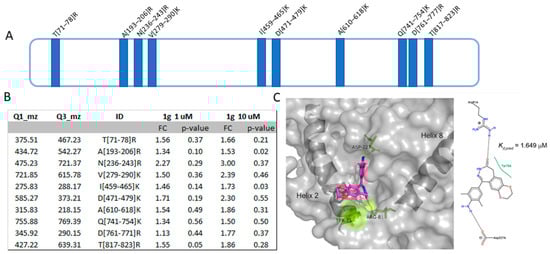(A) Schematic PYGB cartoon is depicted in azure, with the 1g-protected peptides highlighted in blue. (B) Selected PYGB peptides reported with their parent and daughter m/z values, their length and the calculated fold changes (FC) due to 1g protection. p-values have been calculated and only tryptic peptides with a p ≤ 0.5 are reported. (C) Best predicted docking pose of 1g (in violet sticks) on PYGB. The amino acids involved in the interaction are reported in the 2D representation and as yellow sticks in the 3D model. The AMP binding site containing 1g is delimited by the two helices in the cartoon representation.