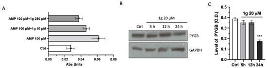 Effect of 1g and AMP on the PYGB activity and expression in U87MG cell lysates. (A) The Abs Units Increment is the variation in the absorbance of the sample after 30 min of reaction. S.D. was calculated on three independent measurements. (B) Representative Western blots of PYGB at different time points. (C) Densitometric analyses of protein levels of PYGB, of U87MG cell lysate after incubation with 20 µM of 1g for 5–12 and 24 h. *** p < 0.001 vs. untreated cells (Ctrl), using a one-way ANOVA with Dunnett’s as post-test.