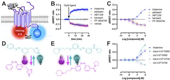 Detection of conformational changes in GPCRs using RET between donor and acceptor molecules that are inserted in between TM5/TM6 and the C-terminal tail allows for the direct quantification of agonist and inverse agonist potency and efficacy upon ligand binding to the receptor. The FRET-based H3R sensor in intact cells and cultured on cover slips allowed for the rapid detection of ligand-induced conformational receptor changes using a fluorescent microscope equipped with a perfusion system with high temporal resolution but a relatively low throughput []. Substitution of YFP and CFP with respectively a red fluorescent dye covalently bound to HaloTag and NanoLuc allows a NanoBRET-based detection of conformational H3R changes in living cells using a 96-well plate reader-based format to readily generate full concentration-response curves for multiple ligands in a single assay run [], as also previously optimized and reported for the α2A-adrenergic receptor, β2-adrenergic receptor, and the parathyroid hormone 1 receptor [,]. As a follow-up on our initial report on this sensor, we evaluated a number of well-known H3R tools (photo-switchable ligands or preclinical candidates) for their conformational effects. Our data indicate that all the preclinical candidates indeed act as inverse agonists, with bavisant showing a clear partial inverse agonistic effect. Moreover, the sensor also allowed the evaluation of the recently developed photo-switchable agonist and antagonist [,], although the light generated by the NanoLuc donor might to some extent also affect the cis-trans ratio due to spectral overlap of the cis-isomer and the NanoLuc emission.