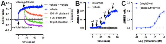 To further explore the dynamics of monitoring conformational changes in the H3R biosensor, we first stimulated Δicl3-H3RNluc/Halo(618)-expressing cells with 10 µM histamine followed by a second injection after 20 min with vehicle or the competitive inverse agonist pitolisant (0.1 to 10 µM). Pitolisant rapidly antagonized the histamine-induced conformational change of the Δicl3-H3RNluc/Halo(618) biosensor in a concentration-dependent manner and stabilized a more inactive receptor conformation at 1 and 10 µM as compared to vehicle (only)-stimulated cells, indicating that pitolisant fully displaced histamine from the biosensor within the measured timeframe at these concentrations (Figure 2A). In addition, stimulation of Δicl3-H3RNluc/Halo(618)-expressing cells by consecutive injections of increasing concentrations of histamine in the same well with 15 min time intervals resulted in a concentration-dependent increase in BRET (Figure 2B). The concentration-response curve (pEC50 = 6.6 ± 0.07) generated from the ΔBRET ratios that were taken 15 min after each consecutive injection had a comparable amplitude to the concentration-response curve that was obtained from wells that were each stimulated with a different histamine concentration (pEC50 = 6.4 ± 0.1) (Figure 2C).