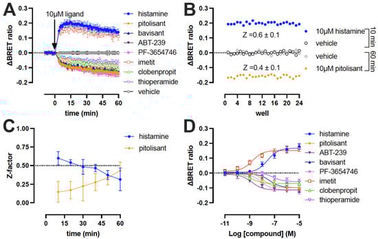 BRET responses of H3R ligands determined on Δicl3-H3RNluc/Halo(618) cell membrane prepared in 50 mM Tris-HCl (pH 7.4). (A) ΔBRET time course of eight H3R ligands at 10 μM concentration. (B) ΔBRET ratio measurements in 24 wells of a 96-well plate containing H3R biosensor-expressing cell membranes treated with either vehicle (10 and 60 min), 10 μM histamine (10 min) or 10 μM pitolisant (60 min) to calculate the Z-factor. One representative graph from three independent experiments is shown. (C) Z-factors over time of cell membrane treated with 10 μM histamine or pitolisant in 96-well plate. (D) Concentration-response curves measured after 30 min stimulation of H3R biosensor-expressing membranes with H3R ligands. Data are displayed as mean ± SD from at least 3 independent experiments performed in duplicate.