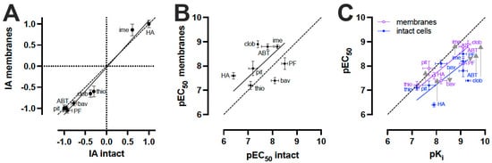 Comparison of H3R biosensor pharmacology on intact cells versus membrane preparations in response to H3R ligands. (A,B) Comparison of intrinsic activity (IA) values (A) and pEC50 (B) obtained from H3R biosensor in intact cells versus membrane preparations upon stimulation with increasing ligand concentrations for 30 min (see Figure 1C and Figure 3D; Table 1). (C) Comparison of pKi values obtained from radioligand competition binding experiments on H3R biosensor-expressing membranes in 50 mM Tris-HCl (pH 7.4) with pEC50 values obtained from H3R biosensors in intact cells (in HBSS) and membrane preparations (in 50 mM Tris-HCl (pH 7.4)) upon stimulation with increasing ligand concentrations for 30 min (see Figure 1C and Figure 3D; Table 1). Differences between pEC50 values obtained from H3R biosensor in intact cells versus membrane preparations are indicated with grey arrows. Data are displayed as mean ± SD from at least 3 independent experiments performed in duplicate. Deming linear regression was used to compare the fitted affinity and/or potency values between the different assay formats, the dotted line represents line of unity (B,C). HA = histamine; ime = imetit; pit = pitolisant; clob = clobenpropit; thio = thioperamide; bav = bavisant; ABT = ABT-239; PF = PF-3654746.