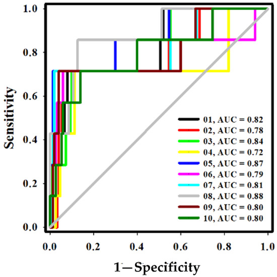 A test dataset with 7 inhibitors (chitin synthase—Ki < 0.001 mg·L−1 and juvenile hormone—Ki < 0.001 mg·L−1) and 350 decoys was employed in ROC curves built to calculate the respective areas under the curve (AUC-ROC) of each pharmacophore model (QFIT value; 0–100). An AUC equal to 1.0 would be found in a model with the capacity to recognize all actives before decoys, and an AUC less than 0.5 would be associated with models worse than a random selection. An AUC greater than 0.70 is associated with a moderate predictive ability [19]. According to the AUC calculation, all pharmacophore models had the ability to differentiate active compounds from false positives (AUC < 0.70; Figure 1).