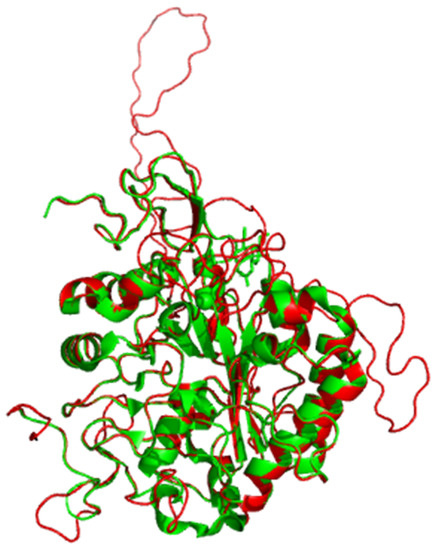 In the following steps, built in the MODELLER 10.1 program, the comparison, alignment, and construction of the Bombyx-Aedes model and its validation were performed. The model generated by the program was aligned in the Pymol 2.0.7 program (Warren Lyford DeLano, The PyMOL Molecular Graphics System, Schrödinger, LLC, New York, NY, USA) as shown in Figure 3, in which the RMSD alignment overlap was 0.396, from which the choice of the best atomic model with a lower score is considered adequate in its structural composition and reliability according to Rahman et al. [44].
