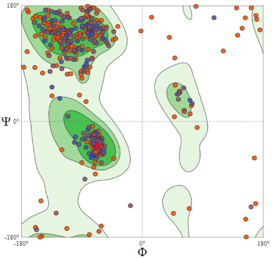 Ramachandran, the Bombyx-Aedes Model terrain. The most favorable regions are shown in dark green, neutral in light green, and non-favorable in white; each amino acid residue is marked with different colors, generated by the structure assessment program (https://swissmodel.expasy.org/assess/KGJVtX/01, accessed on 27 June 2021).