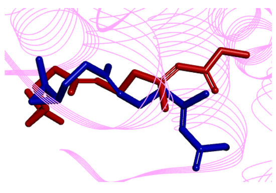 Molecular docking was performed using a validation protocol to determine the pose (conformation + orientation) of the ligands (JH3) within the enzyme active sites (PDB ID 5V13). The root mean square deviation (RMSD) between the reference ligand and the experimental JH3 ligand (1.19 Å) was calculated. The RMSD analysis was determined by considering the most appropriate position of the initial structure around the X-ray crystallographic complex through an experiment of the most stable position so that there is no structural change between the protein and the reference ligand when complexed with the macromolecule under study. The best molecular fit is determined by an RMSD less than or equal to 1.5 [59,60,61,62,63], as shown in Figure 5.