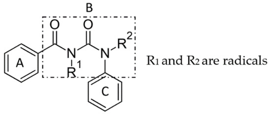 Insect growth inhibitors possess the basic chemical structure of benzoylphenylurean compounds, which consist of three regions for SAR analysis: the benzoyl ring (A), the urea bridge (B), and the aniline (C), as shown in Figure 10. The best-known insecticide is diflunzuron, which has a structure composed of benzoyl urea, similar to sulfonylureas used as oral antidiabetics. Vila-Carriles et al. [127] found that the substitution of aromatic or lipophilic heterocyclic groups increased the potency of compounds such as glibenclamide by 100–1000 times and that the increased affinity was the result of interactions with two overlapping binding sites that were analogous to BPU. This can lead to new insecticides through the screening of bioassays, and in this study, the compound LY 131215, which does not contain a urea bridge, had the best result concerning insecticidal activity [128].