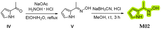 - Hania, M. Synthesis and antibacterial activity of 2-acetyl and 2-formylpyrrole oximes, semicarbazones and phenylhydrazones. Asian J. Chem. 2002, 14, 2. [Google Scholar]