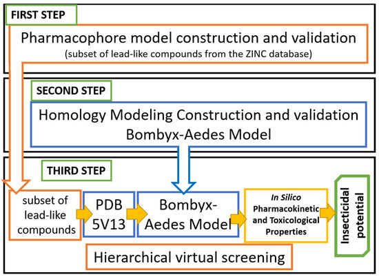 The present work aims to search for new chemical entities with potential insecticidal activity with the dual inhibition of juvenile hormone protein and chitin deacetylases of Aedes aegypti, employing molecular modeling approaches by pharmacophore and docking-based virtual screening. In addition, compounds were developed through the pharmacokinetic characteristics (ADME) of Aedes aegypti physiology and toxicological properties directed at other organisms, mainly humans. The general outline that summarizes the methodological steps in this document is shown in Scheme 1 (see more details in the Materials and Methods section) [14].