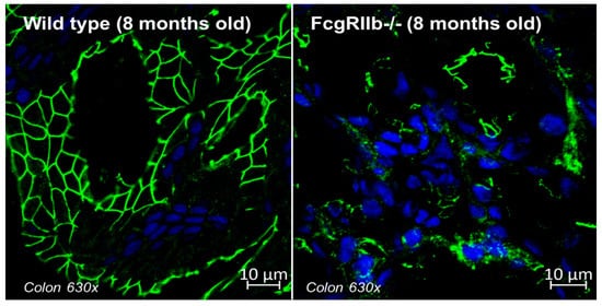 The representative picture of zona occludens-1 (ZO-1, green fluorescent color), a tight junction protein, in enterocyte of the colon from 8-week-old mice of wild-type control and FcgRIIb-/- lupus mice are demonstrated (original magnification 630×) [26]. The blue color is the staining of the nucleus using DAPI (4′,6-diamidino-2-phenylindole), a blue-fluorescent DNA stain (Alexa Fluor 488, Abcam, Cambridge, MA, USA). The samples were prepared in Cryogel (Leica Biosystems, Richmond, IL, USA) and photographed by a ZEISS LSM 800 (Carl Zeiss, Germany). Notably, there is a well-defined green color border in wild type versus the unclear borders of ZO-1-stained colon in FcgRIIb-/- lupus mice at 8 weeks old (full-blown lupus).