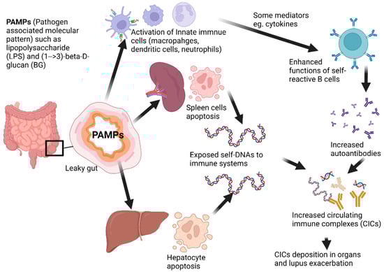 Furthermore, several processes of cell death, such as cell apoptosis and necrosis, are a common consequence of inflammation that could exacerbate lupus activity partly through the presentation of DAMPs, possibly due to inadequate clearance of these molecules during overwhelming cell death [96]. The hyper-inflammatory responses of immune cells (both innate and adaptive immunity) and the immune-induced cell injury in several organs by several stimuli (such as cytokines, PAMPs, and mitochondrial DNA) induce both apoptosis and necrosis of immune cells and parenchymal cells in lupus. Subsequently, the extracellular nucleic acids from host cells and mitochondria and nucleoproteins from the damaged cells might be the autoantigens that facilitate the autoantibody production and circulating immune-complex (CIC) deposition, which highlights the importance of cell death and DAMPs in lupus [97,98]. Although CIC deposition is a possible continuous process in lupus, an alteration in the abundance of CIC is possible which might be responsible for the variation of lupus activity (exacerbation versus inactivity) [99]. In lupus, the production of CIC and lupus exacerbation possibly depends on the increase in abundance of self-antigens from cell death [100,101] and autoantibody production, possibly through the non-specific activation of B cells (or plasma cells) by a viral infection, vaccination, or some medications [102,103]. For the enhanced self-antigen exposure, immune responses against pathogen molecules in blood during leaky gut might increase cell apoptosis as the spleen is responsible for the recognition of foreign molecules in the blood, and profound or chronic activation of some cells in the spleen (such as in the splenic marginal zone) may cause cell apoptosis [104]. For example, LPS during lupus-induced leaky gut might enhance spleen apoptosis, as demonstrated in LPS injection [105] and colitis mouse models [26]. The lupus exacerbation from the enhanced exposure to the self-antigens due to the increased apoptosis is also indicated in cancer treatment by anti-program cell death (PD)-1 (an apoptosis inhibitor) [106]. Moreover, a leaky gut also possibly facilitates autoantibody production. Accordingly, while infection and vaccination induce some specific clones of B cells using some growth factors, such as interleukin (IL)-2, and the pro-inflammatory processes (similar to the role of adjuvants), these factors might non-specifically stimulate self-reactive B cells clones in the host with lupus. Hence, the non-specific inflammatory responses against pathogen molecules during leaky gut might increase self-antigen exposure and accidentally facilitate autoantibodies.