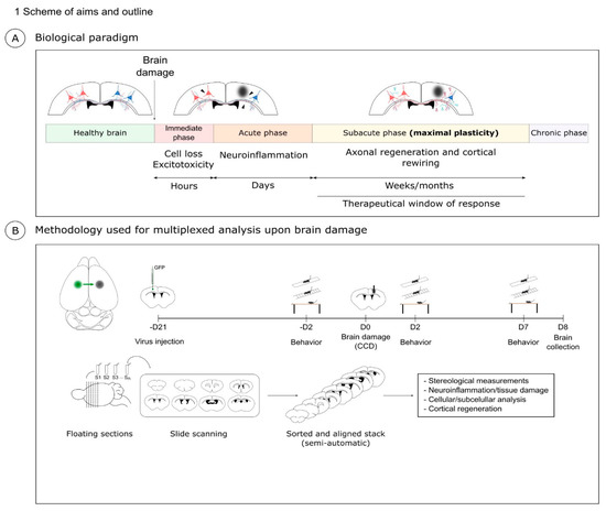 Brain injury (BI) is the major cause of permanent disability. The most common causes of BI are stroke, either ischemic or hemorrhagic, and traumatic injury, either closed or penetrating injury. Independently of the causes, the different brain injuries share some key pathological hallmarks [1,2,3,4,5,6] (Figure 1A). In the immediate or hyperacute phase of BI, excitotoxicity and the activation of cell death pathways lead to neuronal loss in the first hours after damage. The window for therapeutic intervention in this immediate phase is limited to a few hours. Next, in the acute phase, microglia, astrocytes, and peripheral immune cells unleash a complex cellular response aimed at removing damaged tissue and repairing the neural circuits [2,7]. Notably, excessive neuroinflammation may also contribute to neuronal damage, e.g., by increasing oxidative stress or the release of matrix metalloproteinases (MMPs) [8,9].