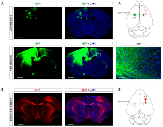 Tracing of cortico-cortical connections. (A) The images show the tracing of cortico-cortical projections from the left to right hindlimb motor cortex (bregma: AP 0.2, LM 1.5, DV −0.5). The upper row shows low-exposure images to see the virus injection site. The lower row shows high exposure to see the axonal sprouting in the contralateral cortex. The boxed area is magnified in the inset. (A’) The cartoon illustrates the schematic location of the contralateral callosal projections (green). In transparency (pink), the ipsilateral connections are shown in (B). The dashed line indicates the rostrocaudal level of the section. (B) We show here a different tracing technique using BDA. The coordinates of injection were in the prefrontal ipsilateral cortex to target axonal sprouting from the right forelimb to the right hindlimb motor cortex (bregma: AP 1.6, LM 1.6, DV −0.5). (B’) The cartoon shows the location of the ipsilateral cortico-cortical connections (red). In transparency (green), the contralateral connections are shown in (A). The dashed line indicates the rostrocaudal level of the section. Scale bar in (A,B), 1 mm; Scale bar in the Inset in (A), 100 µm.
