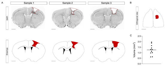 CCD in young mice. (A) In the upper row, representative images of the CCD injury in three different animals. In the lower row, the drawings represent the same slices presented above. The area of the lesion is highlighted as a red line above and as a red area below. Scale bar, 1 mm. (B) The serial organization of the slices allows to provide an orthogonal view of the injury. Scale bar, 1 mm. (C) Graph shows injury volume quantification in young mice. The graph shows mean ± sem; n = 11 mice.