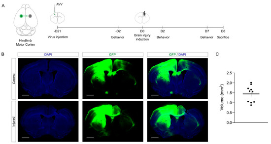To perform the controlled cortical damage (CCD), a 2.1 mm diameter drill tip was introduced in the right primary motor cortex at a constant speed of 0.5 mm/s, using a motorized stereotaxic instrument to reduce injury variation (Stoelting, 51730M). Considering the size of the drill, the coordinates relative to bregma (mm) suffer a slight anteroposterior modification, compared to the ones used for AAV injection: anteroposterior, 0; lateromedial, −1.5; and dorsoventral, −2.5. The drill was introduced into the brain 3 times, waiting 2 min with the drill inside after the first immersion.