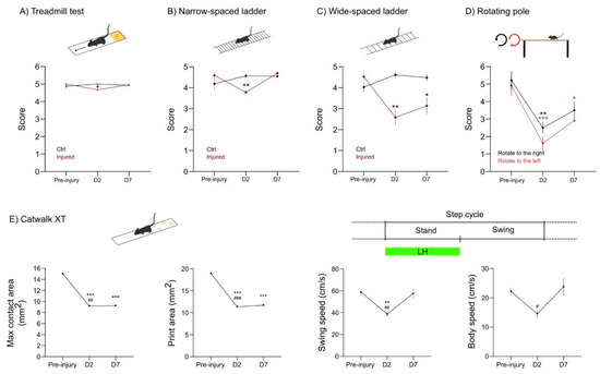 The results show that the max contact and print area of the LH decrease at D2 and D7 upon CCD induction. Furthermore, the swing and body speed decreased at D2. Nevertheless, the animals recovered from this impairment at D7 (Figure 5E).