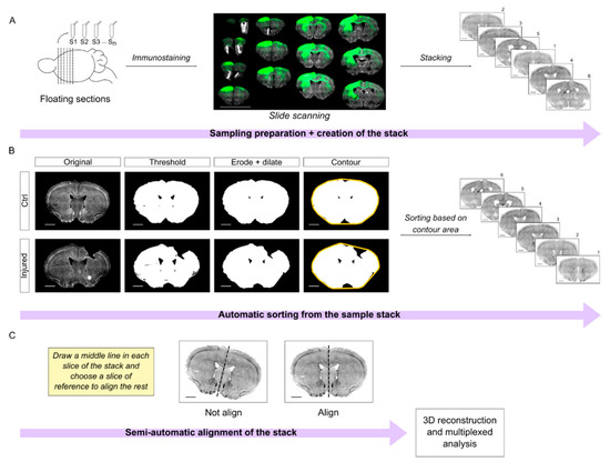 Briefly, the brains were cut in series and processed in floating sections. All the slices are equidistant between each other within a series, facilitating tridimensional reconstruction. Mounted sections were scanned using the Aperio Versa scanner to obtain a complete imaging of the slide. The images were opened in ImageJ to create the preliminary stacks (Figure 6A). To process the stacks, we designed a semi-automatic workflow that is divided into two different steps: sorting and alignment.