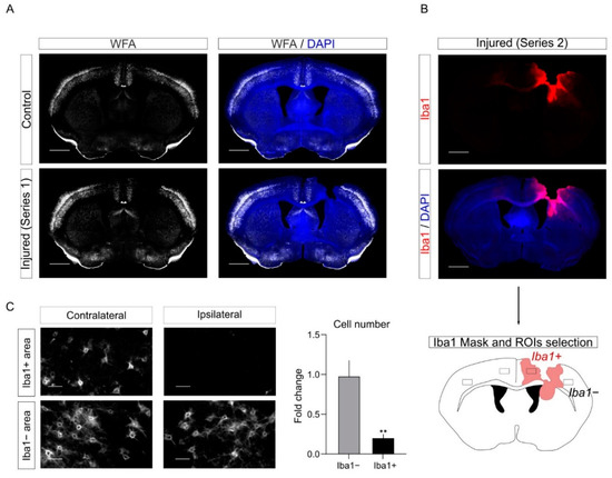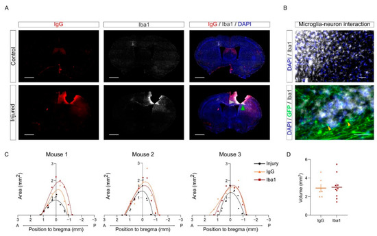 Another ambition of the methodology that we developed was to provide a flexible workflow that may allow a volumetric analysis of the injury while allowing cellular and subcellular resolution. To this aim, we combined the methodology of serial sectioning with an automated slide scanner and a semiautomated bioinformatic pipeline to sort and register the brain sections along the anterior-posterior axis of the bregma. Here, we performed a volumetric analysis of the core of the injury, of the area of inflammation using the marker for microglia/macrophages Iba1, and of the tissue permeability using IgG labeling as a proxy [27,28]. Concurrently, the same serial sections were also labeled for GFP to show the axons of the callosal neurons and for WFA, a marker for PNNs.
