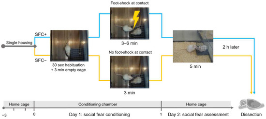 The SFC-induced social fear was assessed one day after SFC (Figure 1). Mice were exposed in their home cage to a cage containing an unfamiliar mouse (i.e., social stimulus; different from the social stimulus used on day 1 during SFC) for 5 min, to assess social investigation as a parameter of social fear. The stimulus was placed near a short wall of the home cage. The test was recorded and analyzed using JWatcher (V 1.0, Macquarie University, Sydney, Australia and UCLA, Los Angeles, CA, USA). Social investigation was defined as direct sniffing of the cage and/or of the social stimulus inside of the cage. The number of attempt approaches was counted and the time that the mice spent freezing was analyzed as additional fear responses. Attempt approaches are behavioral fear responses reflecting risk assessment where mice reach out to investigate the feared stimulus (i.e., social stimulus), without going through with an investigation, whereas freezing is a fear response characterized by cessation of all movement except for that required for respiration [23,43].