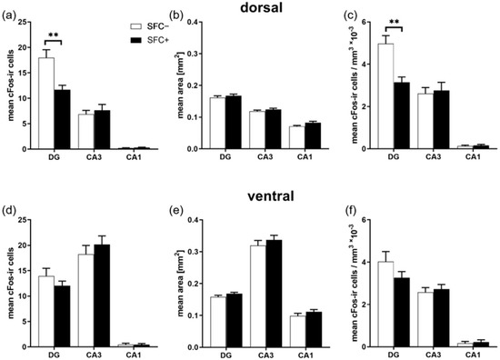 Social fear expression reduces the number and density of cFos-positive neurons exclusively in the dorsal hippocampus. (a,d) Mean number of cFos-ir cells in examined sections within the (a) dorsal and (d) ventral hippocampus of the granular cell layer of the dentate gyrus (DG), and the pyramidal cell layers of the cornu ammonis area 3 (CA3) and 1 (CA1). (b,e) Mean area of investigated layers in mm2. (c,f) Mean cell density (mean number of cFos-ir cells/mm3). SFC−, unconditioned control mice (n = 9); SFC+, conditioned socially fearful mice (n = 10). Data represent means + SEM. Statistical analysis was performed using a two-sample comparison test; p ** < 0.01.