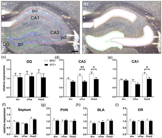 To investigate whether the reduced number and lower density of cFos-ir cells found in the dorsal DG in SFC+ mice is replicated by decreased cFos mRNA levels, we assessed gene expression levels of cFos as well as of two other IEGs, Arc and Fosl2 (Table S4), in the dorsal hippocampus of SFC+ and SFC− mice. As no differences in the cFos protein were found in the ventral hippocampus, gene expression was not investigated in this brain region. RNA was extracted from tissue cut from tissue sections containing the dorsal hippocampus using laser capture microdissection (Figure 4a,b), which allowed the precise extraction of specific brain regions up to small sub-regions and cell layers. As depicted in Figure 4, SFC+ mice showed reduced expression levels of cFos (T(18) = −3.099; p = 0.006) and Fosl2 (T(18) = −2.257; p = 0.037) in the pcl of CA3 (Figure 4d) and reduced expression levels of Fosl2 in the pcl of CA1 (Figure 4e; T(18) = −2.320; p = 0.032).