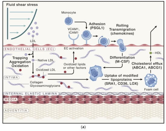 As it is shown in Figure 1a, under the conditions of disturbed blood flow, ECs become “leaky”, which promotes lipoprotein uptake and its entry into the intima. Atherosclerosis is initiated by the accumulation of certain plasma lipoproteins (particularly LDL and triglyceride-rich lipoprotein residues) in the intimal region of the vessel. In the intima, these lipoproteins are oxidized and aggregated, i.e., modified. This modification causes ECs to start expressing adhesion molecules (P-selectin, E-selectin, VACM1 and ICAM1) and chemotaxis molecules (CCR2 and CCR5) for monocytes. Monocytes bind to endothelial adhesion molecules and penetrate the intima, where they differentiate into macrophages in response to locally produced M-CSF and other cytokines. Macrophages engulf modified lipids, which can not be digested. As a result, macrophages form foamy cells.