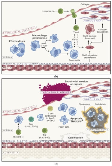 At the next stage, the foam cells die off, forming necrotic nuclei consisting of cellular detritus and cholesterol, as presented in Figure 1 c. Calcification occurs in the intima or media. The lesions may rupture or the ECs may collapse, stimulating thrombus formation, which can lead to myocardial infarction or stroke. However, T cells affect the progression of the disease. T cells secrete IFNγ, which promotes plaque growth and instability. The regulatory T cells express anti-inflammatory cytokines (IL-10 and TGFβ), promote macrophage efferocytosis, and show a negative correlation with atherosclerosis. The TH2 cells express the anti-inflammatory cytokines IL-5 and IL-13. The B cells contribute to chronic inflammation in atherosclerosis.