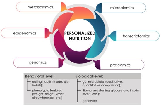 Nutrition is an environmental factor that continuously affects the human body [,,,]. Eating disorders, unbalanced diet, vitamin deficiencies, excessive fatty foods, etc., disrupt the healthy state of the body. The concept of the “4Ps” (personalization, prediction, prevention and participativeness), based on the achievements of “omics” technology, under the concept of “good nutrition”, considers personalized, individual nutrition [,]. Personalized nutrition is nutrition that takes into account the personal characteristics of the consumer (characteristics of the phenotype, genotype, health status, lifestyle, a number of psycho–emotional factors, environmental, climatic conditions, religious, etc.), aimed at improving the healthy state of the body [,] (Figure 2).