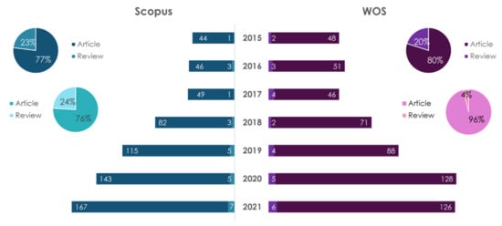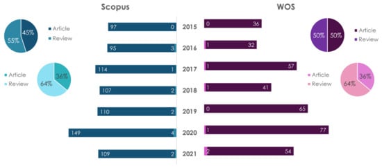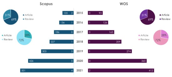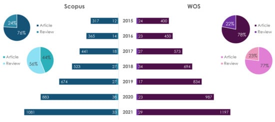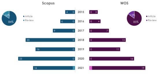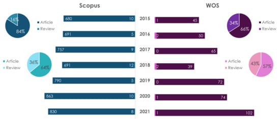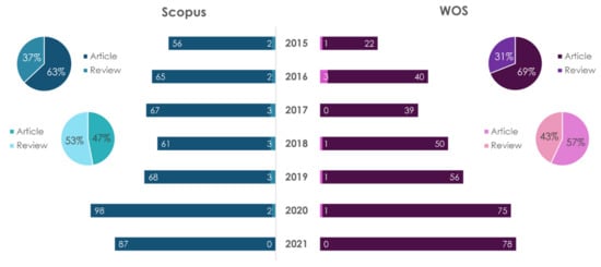 It is seen in Figure 7 that, in 2020, the maximum number of publications appears on this topic. The number of review on “epigenetics of nutrition” in the Scopus database is 1.22 times higher than that in the WOS database. The number of scientific publications (article type) is the same in all databases. On the subject of “epigenetics of nutrition and atherosclerosis”, regardless of the database, the number of reviews is higher than the number of articles: in the Scopus database, the number of reviews is 1.80 times higher than the number of articles, and, in the WOS database—by 2.00 times.