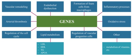 It is known that the number of SNPs plays a key role in the development of atherosclerosis [,,]. A list of genes affecting the development of atherosclerosis is presented in Figure 6 [,].