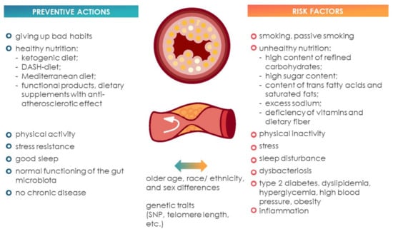 In addition to SNP, other genetic traits influence the development of atherosclerosis. Of particular interest is the relationship between nutrition and telomere length (repetitive, terminal sections of chromosomes) []. Telomere shortening leads to cell aging, and since there is a significant shortening of telomeres in endothelial cells in the areas of atherosclerotic lesions, the pathogenesis of atherosclerosis is also associated with aging []. Telomere length is affected by a number of factors: diet, smoking, alcohol and metabolic syndrome. The effect of nutritional quality on telomere shortening was examined by A. Ojeda-Rodríguez []. As it was shown, following an MD reduces the risk of telomere shortening. It is known that folic and nicotinic acid deficiency increased oxidative stress and telomere dysfunction. Methyl donors (folate, vitamin B11, choline, methionine) are involved in maintaining cytosine methylation. Defects in DNA methylation cause an excessive elongation of telomeres and homologous recombination between telomeres and their fusion []. Epigenetic factors also influence the pathogenesis of atherosclerosis [,].