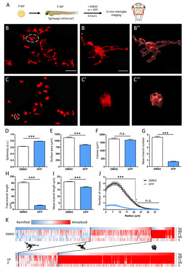 DFP exposure induced major morphological changes of microglial cells. (A) Scheme of the experimental set up. Live 5 dpf Tg[mpeg1:mCherryF] larvae were exposed to either 1% DMSO (control) or 15 µM DFP for 6 h and then imaged with a confocal microscope. The region of interest is framed in red. (B–C) Representative microglial cells in control (B) and DFP-treated larvae. (C) Scale bar: 50 µm. (B′,B″) Magnification of the white-circled microglia from a control larva (B′), and corresponding 3D reconstruction (B″). (C′,C″) Magnification of the white-circled microglia from a DFP-treated larva (C′), and corresponding 3D reconstruction (C″). Scale bar: 10 µm. (D–I) Changes in microglia morphological parameters: sphericity (Sp) (scaled from 0, fully disordered morphology, to 1, perfect sphericity) (D), surface area (S) (E), volume (V) (F), mean branch number (NB) (G), total branch length (TL) (H), and mean branch length (ML) (I) in control (DMSO) (N = 13 embryos, n = 327 cells) and DFP-treated larvae (DFP) (N = 14 larvae, n = 294 cells). (J) Sholl analysis of microglia branch complexity in control (black) and DFP-exposed larvae (blue). Error bars on all graphs represent the standard error of the mean (SEM). Statistics: ***, p < 0.001; n.s., not significant. (K) Clustering of microglial cell populations in control (DMSO) and DFP-exposed larvae (DFP), using five of the previously described morphological parameters (Sp, NB, TL, ML, and S) (see Materials and Methods). Each column corresponds to a single microglial cell, and each parameter is scaled from black (‘resting’ state) to red (‘activated’ state); black dotted lines separate the different microglial populations (ramified, transitional, and amoeboid).