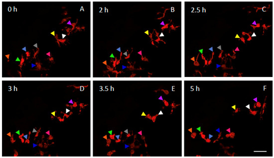 Because the above data indicate that microglia displayed deep morphological changes after 6 h of acute DFP exposure, we next investigated the dynamics of these changes using real-time confocal imaging on live 5 dpf Tg[mpeg1:mCherryF] larvae during 6 h of exposure to 15 µM DFP. In agreement with our previous data [16], prior to DFP addition, microglia were highly branched with several long processes that permanently scan their environment and neighbour cells, and during the first 2 h of DFP exposure, no significant morphological changes could be detected (Figure 2A,B). In contrast, from 2.5 h of exposure, clear remodelling of the cells was observed (Figure 2C,D), which included an increased sphericity and a decrease in the length of the processes. After 3.5 h of exposure, almost all the cells displayed a phenotype resembling ‘activated’ microglia (Figure 2E,F). Excerpts of these representative videos are shown in Supplemental Video S1 (https://urlz.fr/iNwl, accessed on 11 July 2022) for 5 dpf wild-type embryos and Supplemental Video S2 for 5 dpf DFP-treated embryos (https://urlz.fr/iNz4, accessed on 11 July 2022). We next tracked microglia in WT and DFP-treated embryos and measured the distance travelled by these cells (Supplementary Figure S1). Results show microglia travelled a greater distance in DFP-treated embryos than in WT larvae (Supplementary Figure S1A–C).