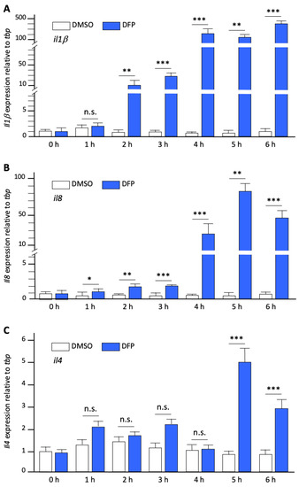 To confirm that the remodelling of microglia observed in DFP-treated larvae does reflect an M1-like inflammatory type of activation of these cells, we next investigated, by qRT-PCR analysis of whole-body RNAs, the expression levels of transcripts encoding a set of pro-inflammatory (Il1β and Il8) and immuno-modulatory cytokines (Il4), before and at different time points during a 6 h exposure to either 1% DMSO or 15 µM DFP. In close agreement with the results obtained in preclinical models of DFP intoxication [20,21,22], our data first revealed a massive expression of il1β (fold change (fc): 413 ± 67, p < 0.0001) and il8 (fc: 44 ± 6, p < 0.0005), together with a significantly increased expression of il4 transcripts (fc: 2.9 ± 0.4, p < 0.001) after 6 h of DFP exposure (Figure 3A). Moreover, precise timing of the expression of these RNAs during DFP exposure indicated that significantly increased expression of il8 (fc: 1.6 ± 0.2, p < 0.05) and il1β (fc: 10.4 ± 2.4, p < 0.01) transcripts was observed after 1 h and 2 h of exposure, respectively, prior to increasing gradually after 3 h (fc: 3.3 ± 0.7, p < 0.001 and fc: 18.5 ± 3, p < 0.001), 4 h (fc: 26 ± 9, p < 0.001 and fc: 217 ± 28, p < 0.001), and 5 h of exposure (fc: 82 ± 9.7, p < 0.001 and fc: 125 ± 15.79, p < 0.001) (Figure 3). In contrast, increased expression of il4 transcripts was delayed compared to that of il1β and il8, starting after 5 h of exposure to DFP (fc: 5.3 ± 0.56, p < 0.001) (Figure 3).