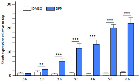 We previously showed that larvae exposed to 15 µM DFP displayed massive neuronal hyperactivation from 1 h to 1.5 h of exposure to DFP [14]. To further investigate this point, we studied, by qRT-PCR analysis of RNAs extracted from larvae at different time points of DFP exposure, the temporal expression profile of fosab, an immediate early gene (IEG) whose expression is an early, sensitive marker of neuronal activation, especially epileptiform seizures [23]. A significantly increased expression of fosab transcripts was detected in larvae exposed to DFP for 1 h, (fc: 2.89 ± 0.4, p < 0.01), which then gradually increased over the next 5 h (fc: 21.7 ± 2.9, p < 0.001) (Figure 5). This result suggests, in agreement with our previous calcium imaging data and the results in rodent models [8,14,21] that neuronal hyperactivation in zebrafish larvae is an early consequence of DFP poisoning that has already started as early as 1 h post-exposure.