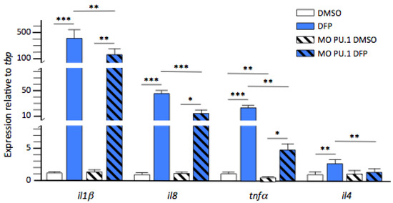 Microglia are key players in DFP-induced inflammation. Expression levels of transcripts encoding cytokines Il1β, Il8, Il4, and Tnfα relative to that of reference tbp transcripts, from control larvae and pU.1 morphants exposed for 6 h to either 1% DMSO (DMSO) or 15 µM DFP (DFP) (in each condition, N = 7–8 samples, n = 7 larvae/sample). Error bars on all graphs represent the standard error of the mean (SEM). Only statistically significant differences between samples are shown: *, p < 0.05; **, p < 0.01; ***, p < 0.001.