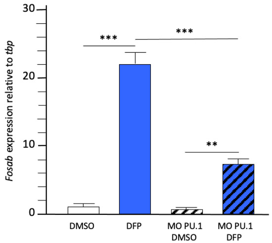 The results indicated that fosab RNAs were still overexpressed in pU.1 morphants exposed to DFP, albeit at significantly reduced levels when compared to that observed in their wild-type counterparts (fc: 7.3 ± 1.5 vs. 22.2 ± 2.9, p < 0.001) (Figure 7), suggesting that DFP-induced neuronal hyperactivation was markedly reduced in larvae without microglia.