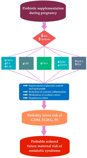 The effect of probiotic supplementation during pregnancy. LPS (lipopolysaccharide); TNF-α (tumor necrosis factor α); IL-6 (interleukin 6); IL-1β (interleukin 1 beta); CRP (C-reactive protein); PAI-1 (plasminogen activator inhibitor-1); GLP-1 (glucagon-like peptide 1); PYY (peptide YY); GDM (gestational diabetes mellitus); EGWG (excessive gestational weight gain); PE (preeclampsia).