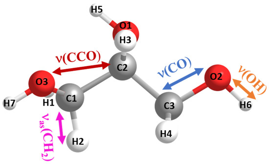 IR-active vibrations being involved in intra- and/or intermolecular interactions. The atomic charges (in electronic units) of the labeled atoms are according to [5]: O1: −0.581, O2: −0.585, O3: −0.585, C1: 0.182, C2: 0.055, C3: 0.182, H1: 0.026, H2: 0.026, H3: 0.04, H4: 0.026, H5: 0.396, H6: 0.396, and H7: 0.396. The calorimetric glass transition temperature Tg of glycerol is 185 K.