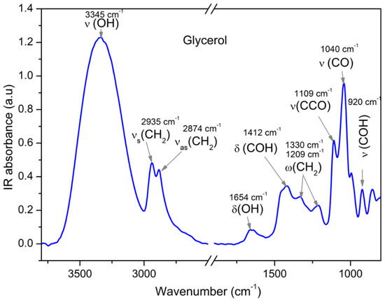 Characteristic IR-absorption bands [13] of glycerol, stretching vibration υ(OH), symmetric υs(CH2) and asymmetric stretching vibration υas(CH2), bending vibrations δ(OH) and δ(COH), and wagging vibration ω(CH2) and stretching vibrations υ(CCO), υ(CO), and υ(COH).