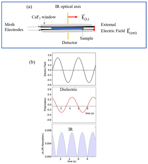 (a) Scheme of the sample cell: is the E-vector of the IR-light and (ext) is the external electric field applied to the sample; (b) orientation polarization as measured by dielectric and IR spectroscopy in the second harmonic of the modulated absorption.