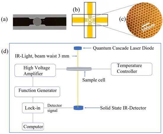 As radiation source quantum cascade laser diodes (S/N 2187/07-05, S/N 2186/07-27, Nanoplus, Germany) were employed emitting IR light either at a wavelength of 2966.8 nm (3370.6 cm−1) or 3493 nm (2862.9 cm−1); it was well directed with a beam waist of ~3 mm. The custom-made sample cell enabled temperature control in the range between 150–400K, with an accuracy of +/−0.2 K; external electric fields were provided by a function generator (Hewlett Packard 3312A) and a high-voltage amplifier (Pendulum A440D, maximum voltage +/−200 V (peak-peak) at frequencies between 1 Hz and 500 kHz) and applied to the sample by using the above-described hexagonal electrodes. As IR detector, a solid-state sensor (PDAV J5 Thorlabs) was used with buffer preamplifier. The signal was analyzed by a lock-in amplifier (SAR 550). The whole set up was fully computer controlled based on custom made LabVIEW software (Figure 4d).