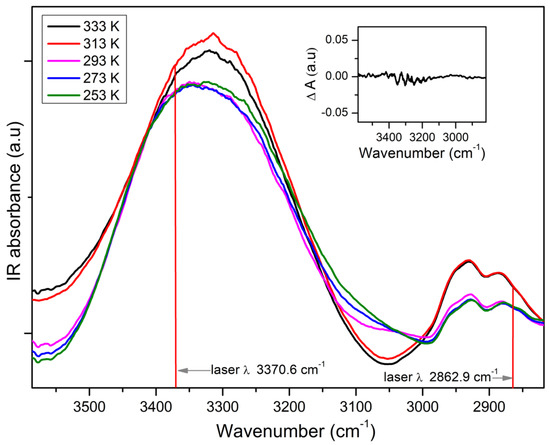 Characteristic IR-absorption bands of glycerol as measured with a Fourier-IR spectrometer at varying temperatures as indicated. The wavenumber of the quantum cascade laser diodes used in this study are marked. As spacer, a poly(ethylene terephthalate) (PET) foil of ~3 µm thickness was used; this results is for an applied voltage of +/−120 V in an electric field strength ~+/−0.4 MV/cm. The inset shows the difference IR spectrum between a sample measured with and without external electric field at 333 K.
